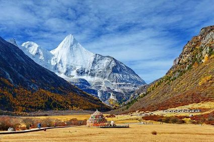 冰晶潔白的央邁勇傲立于天地之間,直指云霄,氣勢(shì)磅礴,讓人肅然起敬。山下,寬闊的峽谷像一條玉帶,環(huán)繞著神山,郁蔥的深林,野花盛開的草地、潺潺的溪流在雪山腳下映襯著壯觀的山峰。