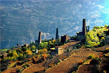 金秋,山寨呈現(xiàn)出一派多彩的畫面,樹葉漸次褪綠,漸染紅色,山頂是皚皚白雪,將田園牧歌式的畫卷展示在人們眼前。
