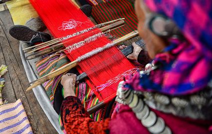 僜人俗稱“僜巴”,是一個生活在我國西藏邊境的族群,人口較少。僜人有自己獨特的語言,生活方式簡樸,起居穿戴有自己的習(xí)俗。僜人織品色彩艷麗,主色為紅色、粉紅色,由于沒有圖紙,每位織娘僅憑記憶織出腦海中的花紋,所以每一幅織品都獨一無二。