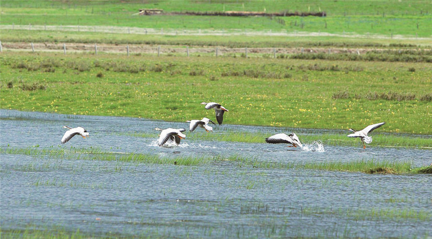 拉龍措古冰漂濕地旅游景區(qū)里有近百種植被,以及黑頸鶴、黑鸛、金雕、胡兀鷲等鳥類動(dòng)物。陽光下的拉龍措,波光粼粼,斑頭雁在湖面“飛舞”,潔白的羽毛伸展后露出圍繞的黑邊,宛若芭蕾舞者在湖面起舞……