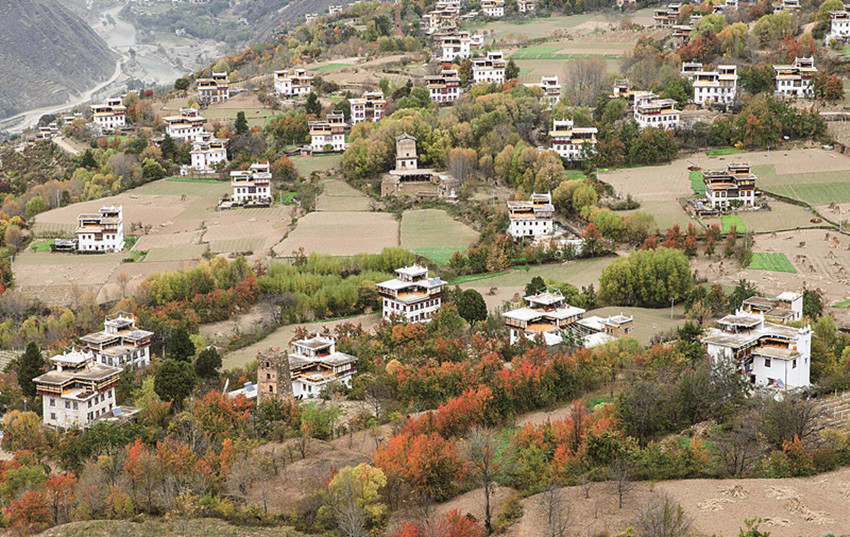 四季更迭,中路藏寨的魅力各異。秋天,正是藏寨最為絢爛的季節(jié)。造型獨特、別致的藏式民居,蜿蜒曲折的林間小道,組成了一幅美不勝收的畫卷。藏寨依山勢迤邐連綿,分布在相對高差近千米的山坡上,藏式樓房灑落在五彩斑斕的彩林中,與山谷、溪流、雪峰交相輝映,極富層次,構(gòu)成了一幅恬靜如詩的優(yōu)美畫卷。