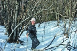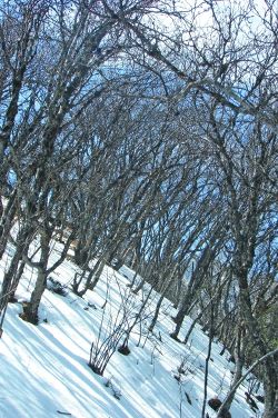 接下來(lái),就是在馬鞍山頂?shù)难┑厣先鲆?、照相?br />    在馬鞍山頂?shù)谋泵婕氨逼?,有一片望不到邊際的樹(shù)林。冬天的這片樹(shù)林,呈成熟而貴氣的暗褐色,葉落枝出,紛亂、素凈、蕭瑟、清貴。于是,以雪地和樹(shù)林作背景,也照了不少相。