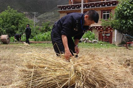 “不能讓鄧珠家成熟了的小麥爛在地里。”近期,巴塘縣陰雨天氣給當(dāng)?shù)卮迕袷崭钚←湈聿槐恪T摽h夏邛派出所民警自發(fā)來到夏邛鎮(zhèn)河西村特困戶鄧珠家田地,以最快的速度幫助收割、捆綁、脫粒等一系列搶收工作。據(jù)悉,夏邛派出所民警在開展“一標(biāo)三實”工作時,將當(dāng)?shù)乩щy戶、殘疾戶、五保戶等缺少勞動力的家庭銘記在心,每逢播種秋收都會進行幫助。