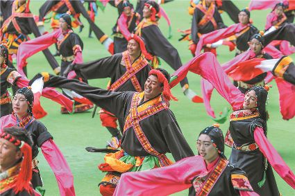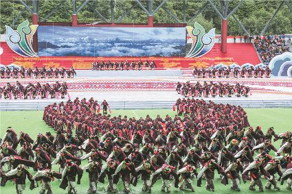 8月8日上午,康定北門體育場內(nèi)歌舞升平、彩旗飄揚,第九屆康巴藝術節(jié)開幕式文藝演出在此進行最后一次帶妝彩排。本次彩排也讓我們對開幕式文藝演出充滿了期待。