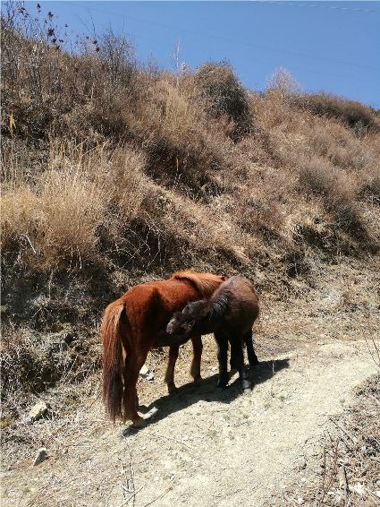 晴天里有陽光,陽光總是充滿愛和溫馨,無論人或是動物,母愛都是最寶貴的甘露。行走在阿里布果,無限愜意油然而生,徜徉在陽光的懷抱,心寧而靜。突然,馬鳴聲打破了這份寧靜,一匹黃馬一邊吃著草,一邊吼叫,不一會兒,一匹小馬駒飛奔而來,走到黃馬身旁,吮吸著甘甜的乳汁。天很藍,陽光很溫暖,世上有一種最美麗的聲音,那便是母親的呼喚。