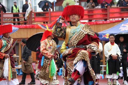 除了歌舞文化,德欽還是民俗文化最大的平臺,神山祭祀是村村寨寨必不可少的活動,在德欽,藏民對山水自然賦予了靈性,認(rèn)為自然也是和人一樣有著生命和靈性,尊重自然演繹出神山祭祀活動豐富多彩?!暗顿潯?藏語稱“百諧”。在德欽農(nóng)村,刀贊是祭祀活動的重頭戲,這一天,不亞于一個盛大的服飾表演。相傳“百諧”是古時村民為消除戰(zhàn)亂,祈福平安的一項傳統(tǒng)祭祀活動,延續(xù)至今已經(jīng)成為一項傳統(tǒng)的民俗活動?!鞍僦C”既是祭祀活動的一個儀式,也是一個獨立的傳統(tǒng)民俗活動,村里每戶一男丁在這一天必須參加“百諧”?!疤K夏”是村里男人戴的最為隆重的帽子,他不同于金邊帽和狐皮帽。長刀是“刀贊”的道具, “吉祥的日子里,我們一敬天地,賜給我們帶來幸福的生活;再敬尊敬的共產(chǎn)黨,為我們帶來平安吉祥;三敬慈祥的雙親,教會我們?nèi)绾巫鲆粋€好人……”朗朗上口的說詞伴著閃閃的刀光起舞,頗具康巴壯士的英武陽剛。