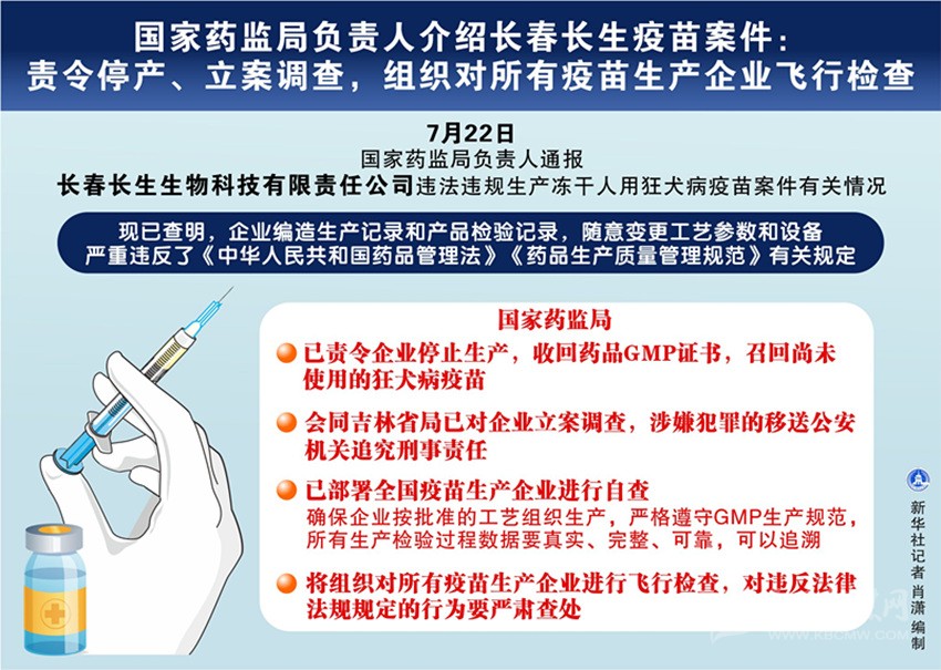 國家藥監(jiān)局負責人22日通報長春長生生物科技有限責任公司違法違規(guī)生產凍干人用狂犬病疫苗案件有關情況。這位負責人說,國家藥監(jiān)局已責令企業(yè)停止生產,收回藥品GMP證書,同時會同吉林省局已對企業(yè)立案調查,涉嫌犯罪的移送公安機關追究刑事責任。國家藥監(jiān)局將組織對所有疫苗生產企業(yè)進行飛行檢查,對違反法律法規(guī)規(guī)定的行為要嚴肅查處。 這位負責人說,根據舉報提供的線索,7月5日,國家藥監(jiān)局會同吉林省局對長春長生公司進行飛行檢查;7月15日,國家藥監(jiān)局會同吉林省局組成調查組進駐企業(yè)全面開展調查。7月15日,國家藥監(jiān)局發(fā)布了《關于長春長生生物科技有限責任公司違法違規(guī)生產凍干人用狂犬病疫苗的通告》。