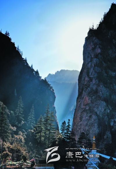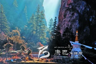 進(jìn)得溝來,卻又是另一番景致。溪水在窄細(xì)的深谷中忽隱忽現(xiàn),水聲叮咚,時而從碎石卵灘下潛淌,時而冒出雪花樣的身影,不張揚(yáng),含靦腆,與兩邊千仞峭崖的兇猛樣恰成強(qiáng)烈對比。此時容不得你不抬頭望山,望天了。極盡險峻的峭壁奇峰,危巖巨石,陰面如潑了墨暈,陽面露了慘白,硬硬地把個溝谷擠成了“一線天”,駭?shù)谜锪锏奶焐弦粌蓤F(tuán)亂云也不敢停歇片刻,欲飄走,卻又被錯落參差的山峰撕得七零八落。更有那墨黑如黛的松柏齊齊地排隊豎立在危崖峭壁間,或一兩階,或三四階,如挎刀武士護(hù)著峭崖,又如黑大漢長的亂糟糟的絡(luò)腮胡,徒增添了猙獰之貌。傳說皮察溝內(nèi)有座黑教的神山——呷拉神山,每到“朝山會”,農(nóng)牧民前去神山朝拜。然而,呷拉山頂不知何時棲居了一只碩大的“夏甲曲絨”(意為一種兇惡的鳥),不時將村里百姓的牛、羊叼到山頂吞食。藏王格薩爾得知此事,決心要除掉“夏甲曲絨”。 “夏甲曲絨”得知格薩爾王大軍前來征服它,十分懼怕,數(shù)日藏于洞中不敢出來。格薩爾王隱身于巖石背后,讓王妃珠牡設(shè)法引“夏甲曲絨”出洞。“夏甲曲絨”形體碩大,棲息的洞無法掩其全身,頭部露在外面,時時觀察動靜。珠牡到接近洞口的地方,滔滔不絕地贊譽(yù)“夏甲曲絨”長得美麗,它禁不住贊美,漸漸地伸長頭頸,最后驕傲地露出潔白的全身,并高昂著頭。格薩爾王趁機(jī)迅速張弓搭箭,一箭射中“夏甲曲絨”的頸部,血流滿山,以后這座山便變成了紅山。當(dāng)“夏甲曲絨”負(fù)痛逃至皮察溝“一線天”時已精疲力竭,便停留在山崖中。格薩爾王隨即趕到,藏于灌叢,背靠巨石用腳一蹬(至今天一巨石呈凹形,似有人蹬過),再次射中“夏甲曲絨”。“夏甲曲絨”負(fù)痛逃去,停在覺然村一巨石上做垂死掙扎時,它的爪爪在巨石一抓了無數(shù)道溝痕,后人把這個巨大石稱為“鬼抓石”……我無意去尋找“紅山”、“腳蹬石”、“鬼爪石”等,也沒想深究格薩爾除妖是否用過“美人誘惑計”,但卻在溝谷里發(fā)現(xiàn)一個與眾不同的現(xiàn)象:在一處窄小的谷地路傍,長滿了雜枝黑蔓的灌叢,灌叢上彩幡密布,鉆進(jìn)灌叢,里邊竟然塑了一尊格薩爾王的神象,神象不高大,卻威儀,的確像是藏在崖壁下灌叢中……很容易讓人想到故事中的情節(jié)。