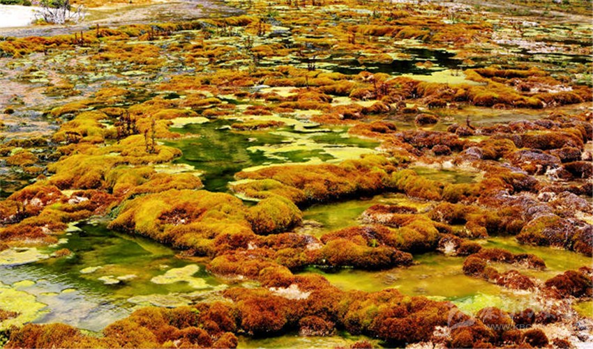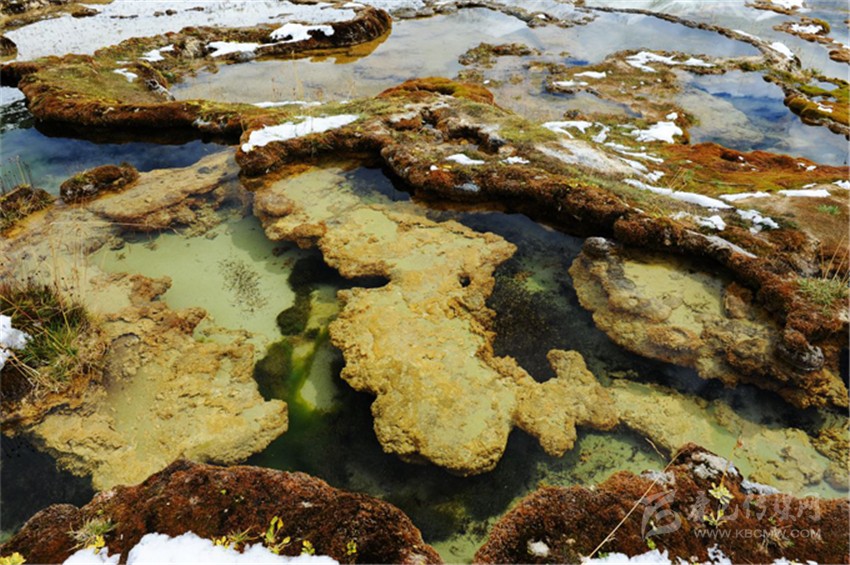 灘長約3000米,寬約200米,共有7個(gè)臺階,上面形成了大小不一的彩池,里面的各類水生植物,暢游的羌活魚(小鯢)等,給這片古老的地質(zhì)奇觀帶來了無限的生機(jī)。在海拔4300米處,有一眼噴出1.5米高的溫泉,水溫常年在30度左右,是玉龍泉華灘的主要水源。