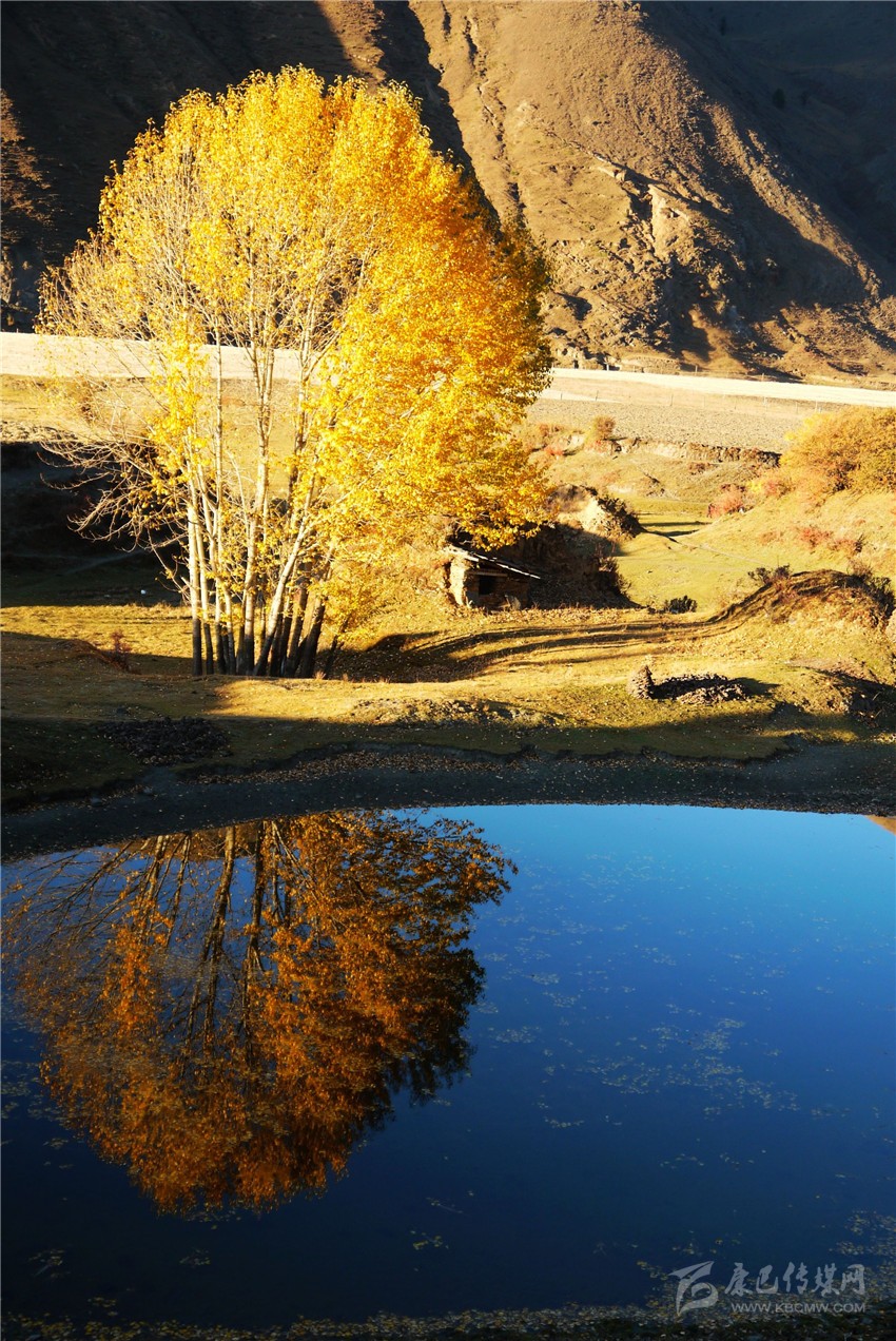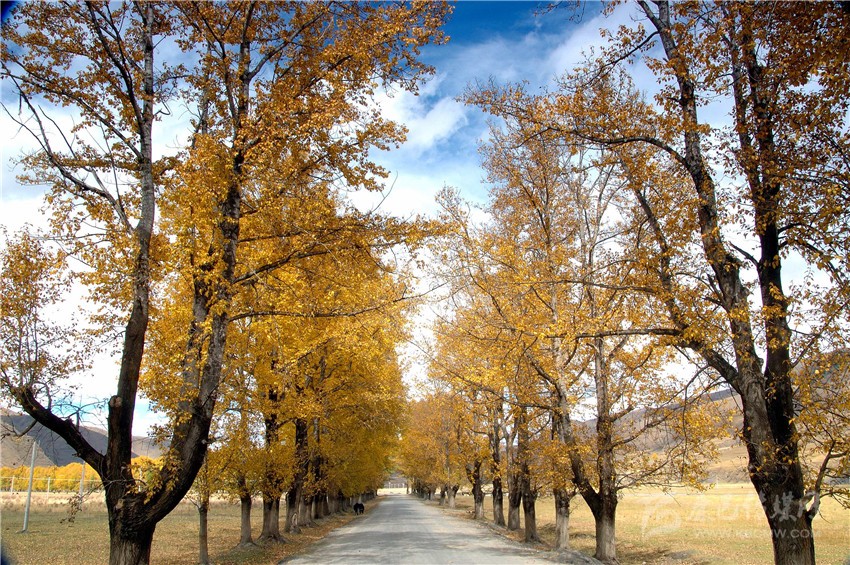 一條淺淺的小河與公路相依相偎地蜿蜒流淌,房前路旁一棵棵挺拔的白楊在秋風(fēng)秋陽中炫耀著特有的金黃。遠處的山脊,舒緩地在天幕上劃出一道道優(yōu)美的弧線。滿眼藍色、白色、金黃、黑色、綠色的飽和色塊,在明麗的秋陽光線的描繪中,凸現(xiàn)著流暢的色彩和線條,恍如置身畫中。