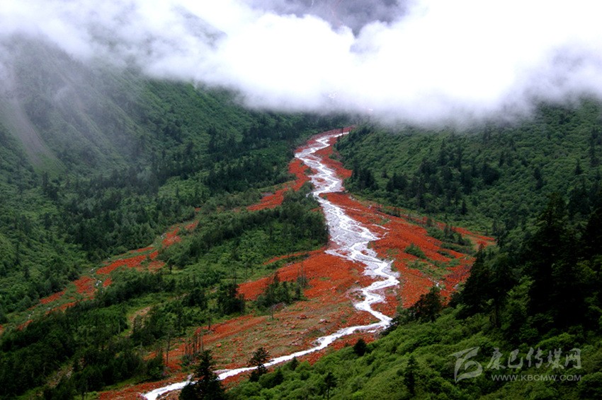 紅石灘位于海螺溝景區(qū)雅家埂兩河口地帶,落在山間尤其是溪水流經之處的花崗巖,因其上附著一層紅色的藻類,故被稱為紅石。