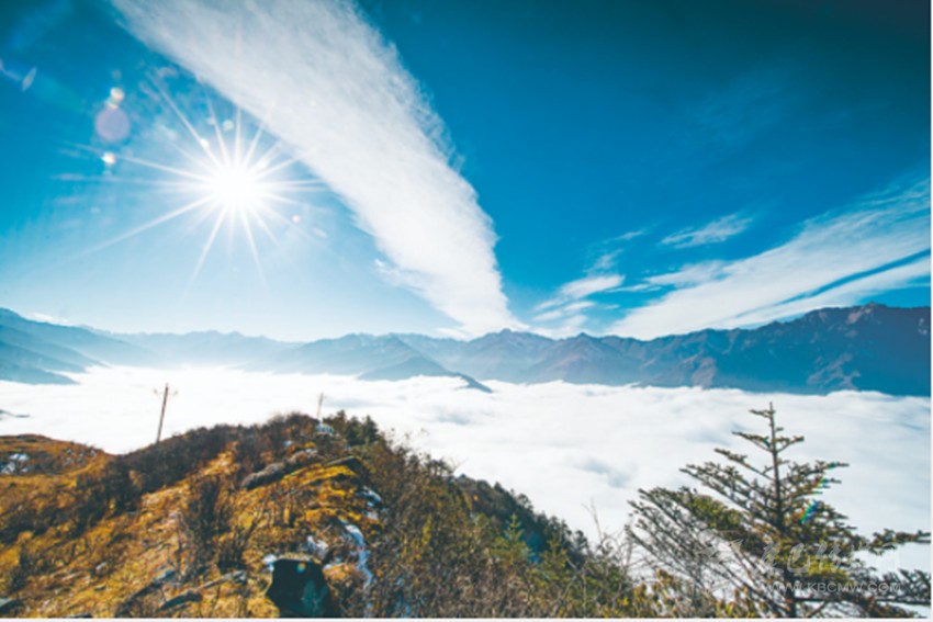 在阻隔灣壩通往外域的山脈中,有一個地方名為小卡子。一條簡易的林區(qū)便道通往那里。從這條便道穿越峽谷的最陡處,越過林線的高度,最終將會馳上一條刀刃狀的山脊。脊的兩側,西為著名的大雪山、貢嘎山,東為令牌山、則爾山。這條山脊的海拔在5000米左右,這是足以傲視群山的高度,而且恰恰又是云層頂端的高度。常常溝底陰云低罩,山腰云霧繚繞。到了山脊,天空頓時空闊遼遠,艷陽高照,而山脊的兩側,云海飄渺,宛若仙境。而遠處的山巒大多又在云層之上,峰高云低,如孤島浮舟。