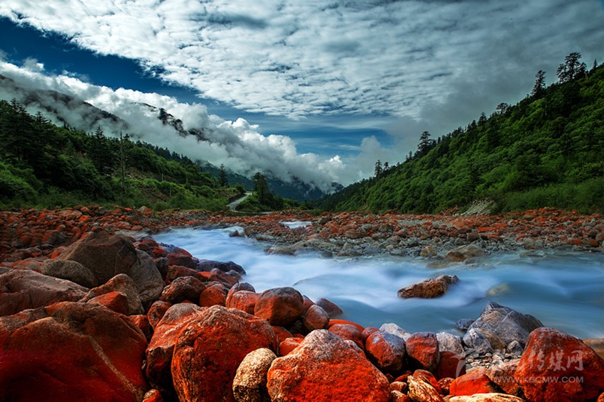 紅石是大自然贈賜予貢嘎山地區(qū)最珍稀的物種之一。在海螺溝、燕子溝、南門關(guān)溝、雅家埂等景區(qū)里分布著大面積的紅石灘,每一塊石頭都被紅色旱蘚披上了一件美麗的紅色外衣,紅石在河流兩旁堆積,成群的紅石變成一種流動的紅色,與清冽的流水相伴順流而下,讓人感嘆大自然的神奇造化,是世界上最大的紅石公園。