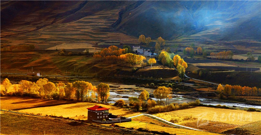 沿著公路行駛,您會看到公路兩邊的青稞都已金燦燦,綠葉變黃,溪水靜靜流淌,小樓上的經(jīng)幡隨風(fēng)舞動,白塔依稀林立,陽光照耀下的東路各縣市的空氣中充收獲的氣息。 藍天白云,小橋流水,金黃色的白楊樹,精美的藏式小樓,在光與影的映射下,仿若一幅油畫,等待您的發(fā)現(xiàn)和欣賞。