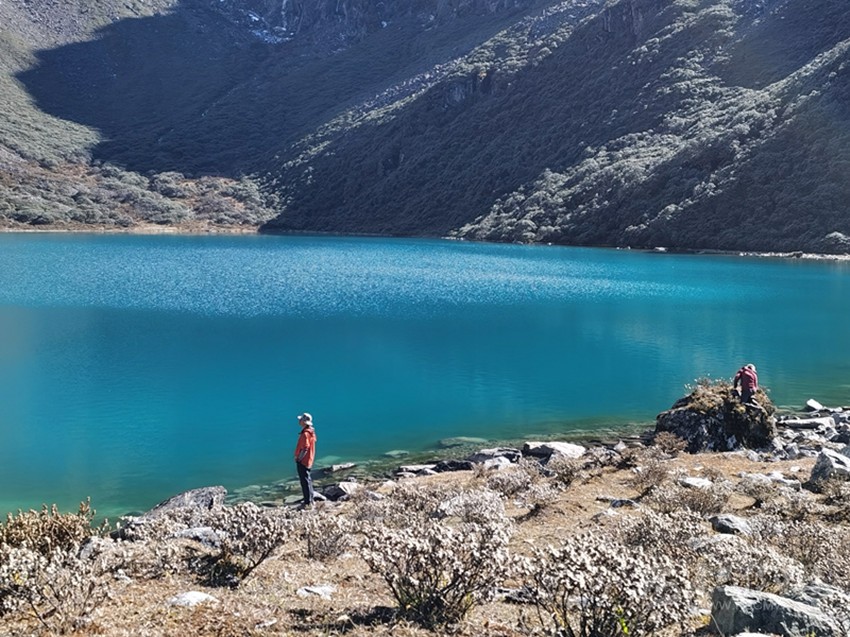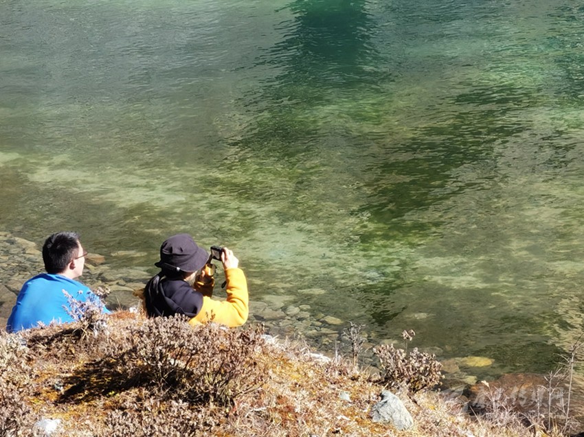 白海子的美較其他海子來(lái)說(shuō),就在于湖水的顏色,貢嘎青旅的顧問(wèn)狼哥介紹說(shuō),現(xiàn)在大家喜歡叫白海子為翡翠海,就是因?yàn)樗念伾?,如一塊藍(lán)綠的翡翠鑲嵌在高山的懷抱中,隨著光線的不同顏色變幻莫測(cè)。在康定的眾多海子中,這樣的顏色很少見(jiàn),也更吸引人。