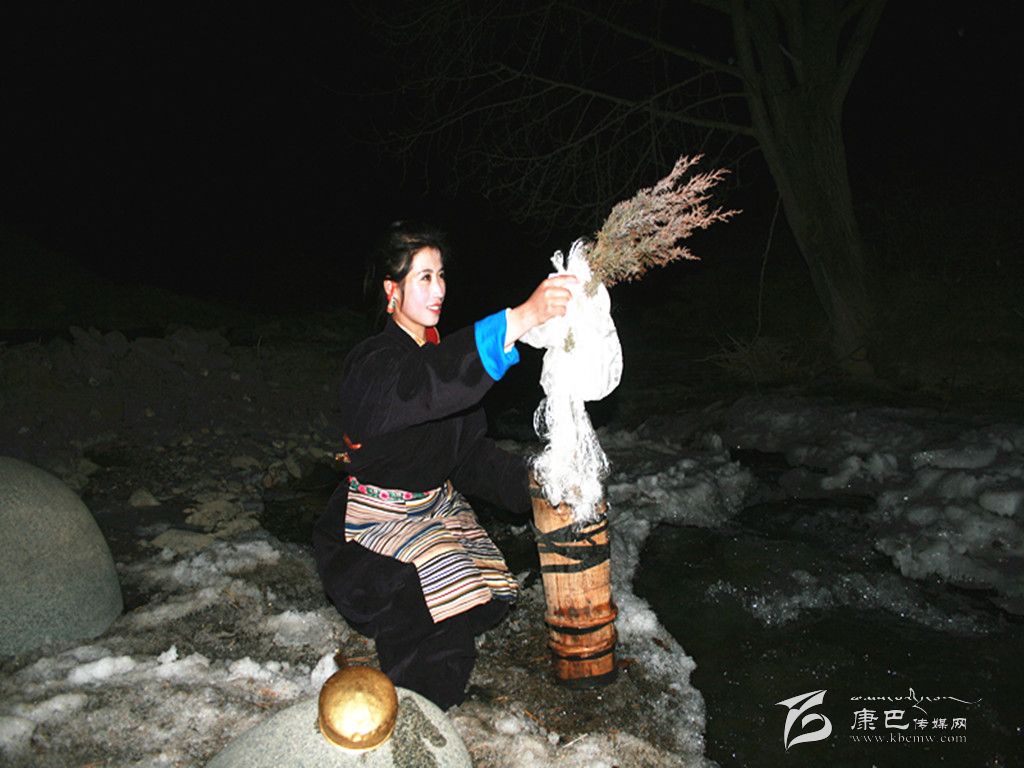在除夕這天,家里的婦女會(huì)把庭院,房屋重新打掃一遍。把垃圾再清理一次。因?yàn)榱?xí)俗認(rèn)為,初一掃地和除垃圾會(huì)把一年的財(cái)運(yùn)和好運(yùn)都掃走。這天,大人小孩還要忙著洗頭、洗澡,搞好個(gè)人清潔衛(wèi)生。而除夕之夜最重要的一個(gè)儀式是“搶頭水”。(新年的第一桶水—晨星水)。傳說(shuō),晨星水是人間最吉祥的水。它可以獻(xiàn)神,可以潔身,可以祛病,洗滌一切污垢和不祥,帶來(lái)平安和幸福。從除夕夜十二時(shí)開(kāi)始,一個(gè)個(gè)懷抱柏樹(shù)枝和哈達(dá)的姑娘或小伙子們披著繁星,爭(zhēng)先恐后地去背晨星水。第一個(gè)先到河邊的要熏燃桑煙,并用哈達(dá)繞上柏樹(shù)枝蘸水向空中拋灑三次,并把柏樹(shù)枝放在河邊。背回的晨星水首先要供奉佛祖。然后才可以用來(lái)燒茶、洗漱。而家里的五谷斗上則盛滿(mǎn)了糌粑、炒青稞粒、人參果等食品,上插青稞穗,也有在八寶碗里用糌粑和五彩酥油做成“切巴”,供奉在佛堂里。這一切都是為了祈禱來(lái)年風(fēng)調(diào)雨順、人畜兩旺、喜獲豐收。除夕夜,在正房桌子上還要擺上各式油炸果子、牛肉坨坨、糖果以及青稞美酒、飲料等等美味佳肴,開(kāi)始迎接新年的到來(lái)。