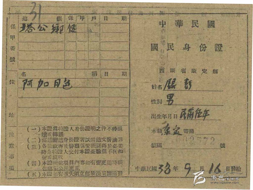 這張看似簡陋的紙張,就是到了1949年才發(fā)給這位居住在塔公鄉(xiāng)、名叫“銀彭”這個(gè)人的國民身份證,而對(duì)于今天的我們則是難得一見的珍貴檔案材料。