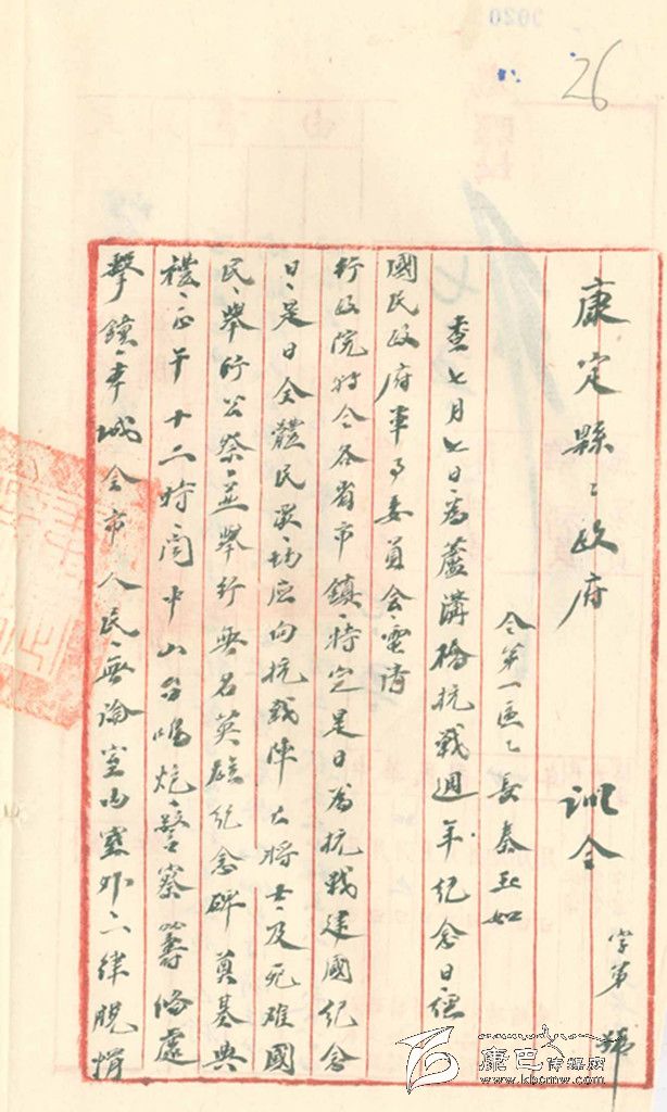 民國27年,即1838年7月5日,康定縣政府縣長杜履謙發(fā)出“訓(xùn)令”,內(nèi)容如下:“查7月7日為盧溝橋抗戰(zhàn)周年紀(jì)念日,經(jīng)民國政府軍事委員會(huì)電請(qǐng)行政院特令各省市、鎮(zhèn):特定是日為抗戰(zhàn)建國紀(jì)念日。是日全體民眾均應(yīng)向抗戰(zhàn)陣亡將士及死難國民舉行公祭,并舉行無名英雄紀(jì)念碑奠基典禮。正午12時(shí),聞中山臺(tái)鳴炮,警察籌備處擊鐘,本城全市民,無論室內(nèi)室外,一律脫帽立正默哀五分鐘。禁止屠宰,素食一日。此令”。