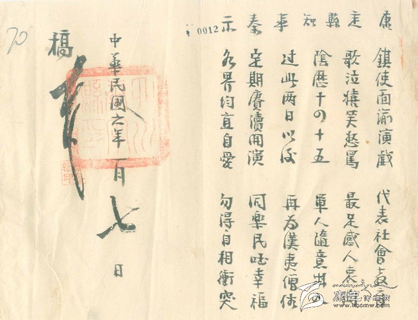 除此之外,康定縣知事又煞費(fèi)苦心地再寫了一篇“順口溜”式的告示,告示上寫道:鎮(zhèn)使面喻演戲,代表社會(huì)教育。歌泣嬉笑怒罵,最足感人衷曲。陰歷十四十五,軍人隨意出入。過(guò)此兩日以后,再為漢藏僧俗。定期庚續(xù)開(kāi)演,同樂(lè)民國(guó)幸福。各界均宜自愛(ài),不得自相沖突。