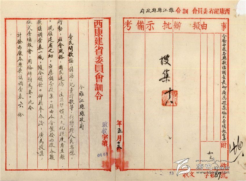 訓(xùn)令題目是“令發(fā)西康各縣歌謠調(diào)查表仰廣為收集依式查填報(bào)會(huì)”,由此可知,西康其他各縣也收到了同樣的訓(xùn)令。其內(nèi)容為:查民間歌謠、諺語(yǔ),兒童詩(shī)歌等,影響于人民思想、行動(dòng)、社會(huì)風(fēng)俗、國(guó)民道德、生活習(xí)慣及文化程度者至巨?,F(xiàn)值建省之初,急應(yīng)調(diào)查征集,茲由本會(huì)制發(fā)西康各縣歌謠調(diào)查表一紙,隨令頒發(fā)。仰于奉令后,廣為收集,依式填報(bào)會(huì),備研討為要。此令,計(jì)發(fā)西康各縣歌謠調(diào)查表6份。署名是“西康建省委員會(huì)”。