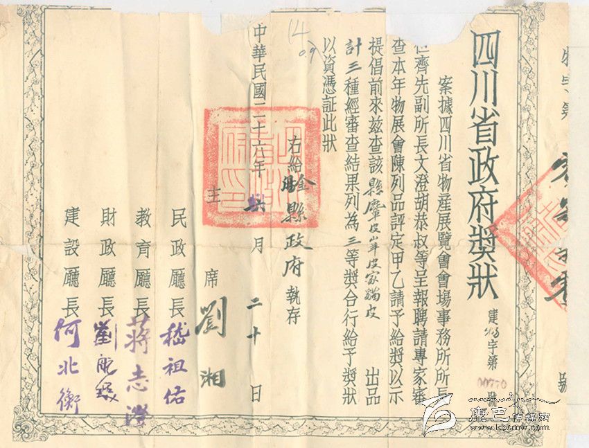在公元1937年期間,當(dāng)時(shí)還是由四川省的實(shí)力軍閥劉湘在擔(dān)任四川省的主席,當(dāng)時(shí)四川省的民政廳、教育廳、財(cái)政廳、建設(shè)廳是承辦者,所以獎狀就是以這些當(dāng)年的頭面人物所在機(jī)構(gòu)和他們的個(gè)人簽名發(fā)出。