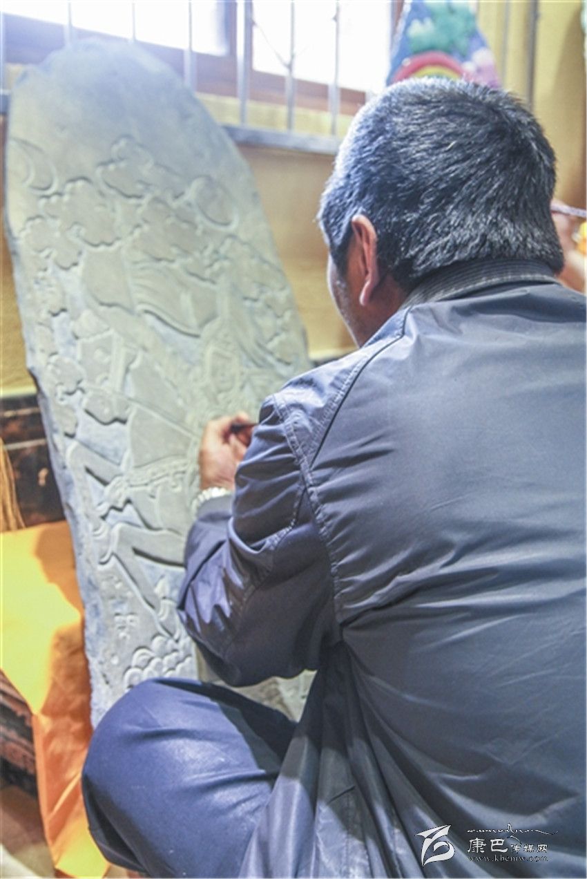 “刻一幅一米高、八十公分寬的作品,一般用時(shí)在一個(gè)月以上。”所彭接過巴德的話說,在格薩爾彩繪石刻中,最理想的尺寸就是一米高、八十公分寬。但由于各種原因,現(xiàn)在很不容易找到這么大、又適合石刻的石板。此外,也有一些人采用機(jī)器進(jìn)行刻制,但這就失去了藝術(shù)的本來價(jià)值。