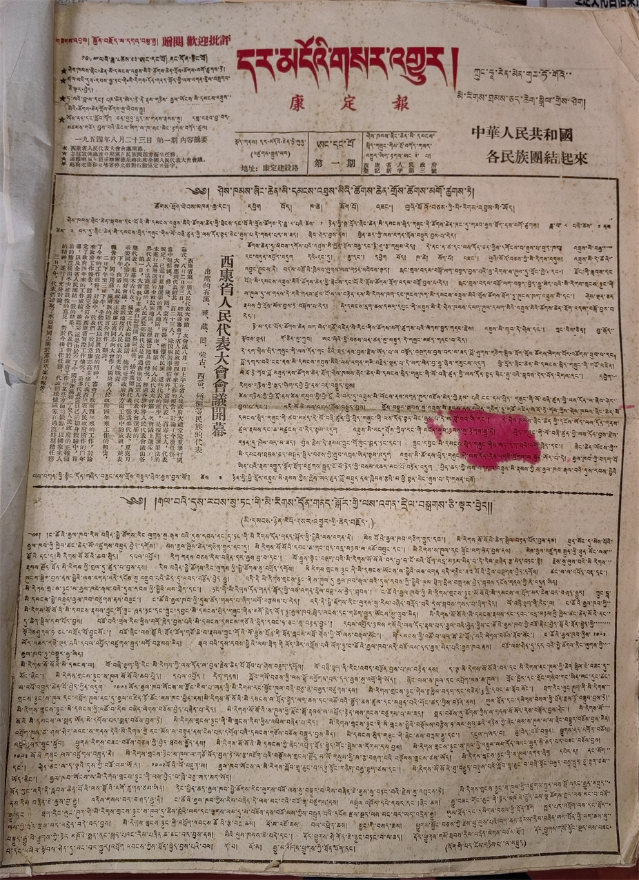 1954年12月以前出版的《康定報(bào)》,刊期不定,版數(shù)不定,刊期長(zhǎng)時(shí)達(dá)17天一期報(bào)紙,短時(shí)7天一期報(bào)紙;版面有時(shí)是對(duì)開(kāi)四版,有時(shí)是對(duì)開(kāi)二版。1954年12月10日以后,基本上能十天出一期報(bào)紙,1955年1月以后改為周刊。西康省與四川省合并后,經(jīng)四川省委宣傳部批準(zhǔn),《康定報(bào)》從1956年1月起,正式改為周五刊。改刊初期,每期報(bào)紙每個(gè)版都用藏、漢文對(duì)照排版。后來(lái)又改為藏、漢文分別組版,即一、二、三版為藏文,四版為漢文。