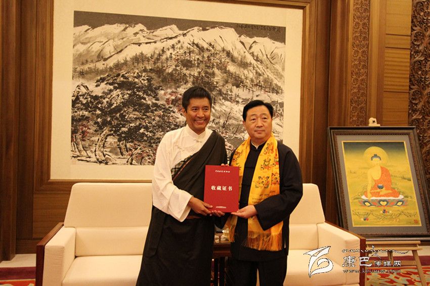 產(chǎn)業(yè)化發(fā)展的探索之路,不僅圓了年敘·多吉頓珠的“文化產(chǎn)業(yè)夢”,而且也讓他實現(xiàn)了一次華麗轉(zhuǎn)身,成為一名有擔(dān)當(dāng)?shù)钠髽I(yè)家。今年9月5日至15日,由中華文化發(fā)展促進會、西藏自治區(qū)文化廳、西藏自治區(qū)文學(xué)藝術(shù)界聯(lián)合會、西藏自治區(qū)文化產(chǎn)業(yè)協(xié)會主辦,西藏崗地文化產(chǎn)業(yè)集團、西藏拉姆拉綽唐卡畫院承辦的“西藏唐卡藝術(shù)——多吉頓珠、丁噶唐卡作品展“在北京中國國家博物館舉行。他和丁嘎先生現(xiàn)場向國家博物館捐贈了《釋迦牟尼》、《五方度母》、《綠度母》和《觀音》四幅精品,這是國家博物館首次收藏多派唐卡和嘎瑪嘎智畫派唐卡,填補了國家博物館館藏嘎瑪嘎止畫派和多派唐卡的空白。國家博物館館長呂章申先生熱情為兩位大師頒發(fā)了收藏證書并激動地說:“多吉頓珠先生和丁嘎先生捐贈的精品力作,豐富了中國國家博物館的館藏,更好地弘揚了西藏文化藝術(shù)。國家博物館有責(zé)任把最好的藝術(shù)品收藏起來,留存于后世。”