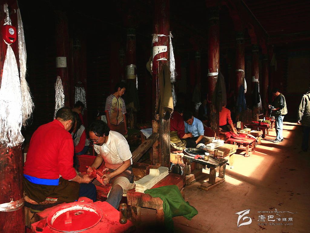 德格印經(jīng)院的各種傳統(tǒng)產(chǎn)業(yè),當(dāng)?shù)鼐用竦纳a(chǎn)勞動(dòng)都立足于當(dāng)?shù)刈匀画h(huán)境資源,并且全面地支持著傳統(tǒng)印刷技術(shù)系統(tǒng)的各階段。包括“瑞香狼毒”的草根造紙方法,均與德格地區(qū)的傳統(tǒng)產(chǎn)業(yè)有關(guān)。藏紙是當(dāng)?shù)鼐用裼脗鹘y(tǒng)手工方式制造的印刷紙,是用一種叫“阿交如交”(瑞香狼毒)草本植物根須為原料制造而成。這種紙的顏色微黃,質(zhì)地較粗厚,但纖維柔軟,不易脆,吸水性強(qiáng),同時(shí)還具有防蟲蛀、防鼠咬,久藏不壞的特點(diǎn)。印經(jīng)院的印刷用色通常分為紅版和墨版兩種。木刻印版的刻制工作更為艱辛,印經(jīng)院選聘藏文知識(shí)高深淵博的名士將所要刻制的圖書進(jìn)行嚴(yán)格細(xì)致的三級(jí)審校,才可由聘請(qǐng)的藏文書法技藝精深的學(xué)者嚴(yán)格按照藏文書法正楷要求開始橫版書寫工作,他們將圖文描繪在半透明的薄紙上反貼在板面上。刻工們依據(jù)紙上的色差進(jìn)行刻制,刻完后編師們?cè)谇鍢由线€要進(jìn)行三校,版面改動(dòng)較多的必須進(jìn)行重刻,一般的進(jìn)行補(bǔ)刻。直至完全準(zhǔn)確無誤時(shí)將印版放在酥油里浸泡一天后,取出曬干,再用一種名叫“蘇巴”的植物根熬水洗凈曬干,至此一塊印版的制作才算全部完成,可入庫上架和進(jìn)行印刷。通常情況下,技藝嫻熟的一名工人每天完成一張書版的單面刻制,畫版刻制工作量更大。雕刻技工都是來自本地及周邊地區(qū)的民間藝人。
