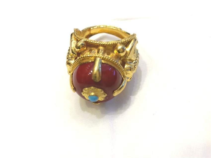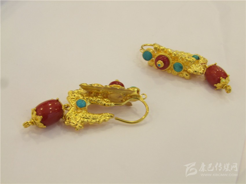 龍頭耳環(huán)在藏民族配飾歷史上較為久遠,設(shè)計師在遵循龍頭耳環(huán)傳統(tǒng)基礎(chǔ)上,結(jié)合當下的潮流,用紅藍寶石做點綴,并在紅色寶石上打上精美的黃金花,很好的詮釋了個性與時尚的結(jié)合。
