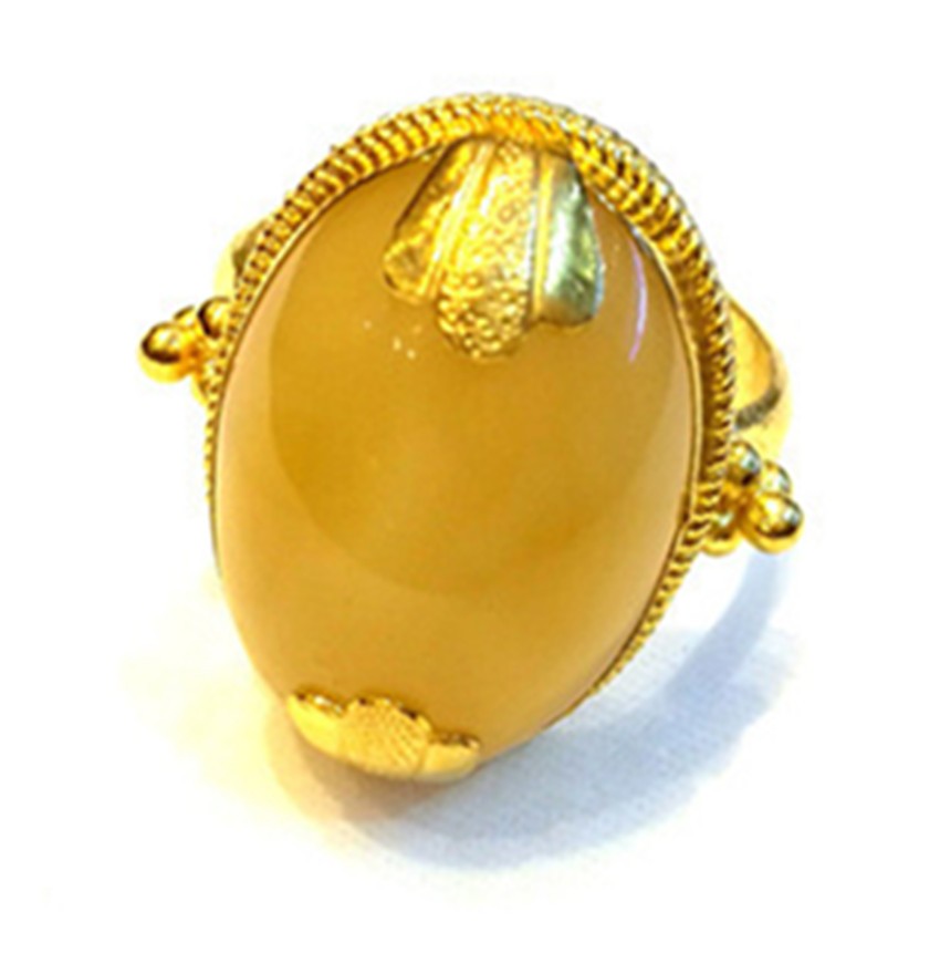 蜜蠟是藏家裝飾中的上成品,藏民族對蜜蠟的喜愛是非常誠懇的,表達著他們對大自然的無限崇敬之情與大自然饋贈的感謝之情。在他們看來,蜜蠟除了能夠作裝飾品佩戴、收藏之外,最引人注目的就是靈性修行之功效,設(shè)計師在此款戒指的設(shè)計上,緊扣藏民對蜜蠟的喜愛,并將漢式花邊與蜜蠟結(jié)合,是對藏漢文化交流較好的體現(xiàn)。