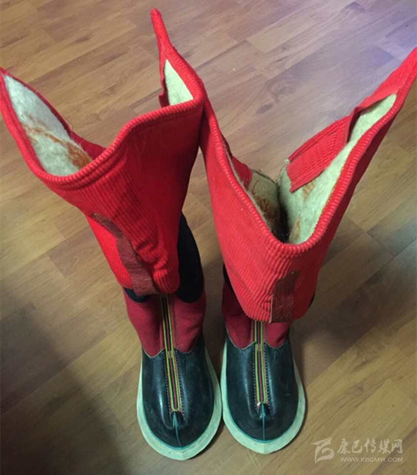 藏靴,是藏民不可缺少的用品,靴子的原料為牛皮,用較厚的牛皮作底,薄一點的作面,底和面的縫合則用牛羊皮條,鞋口前端還有帶毛的牛羊皮裝飾。從外觀上看類似舞臺上古裝戲里將相穿的靴子,靴子內里有毛絨,既暖和又舒適,鞋腰還配有由氆氌等原料制成的各類樣式的線條、花紋。