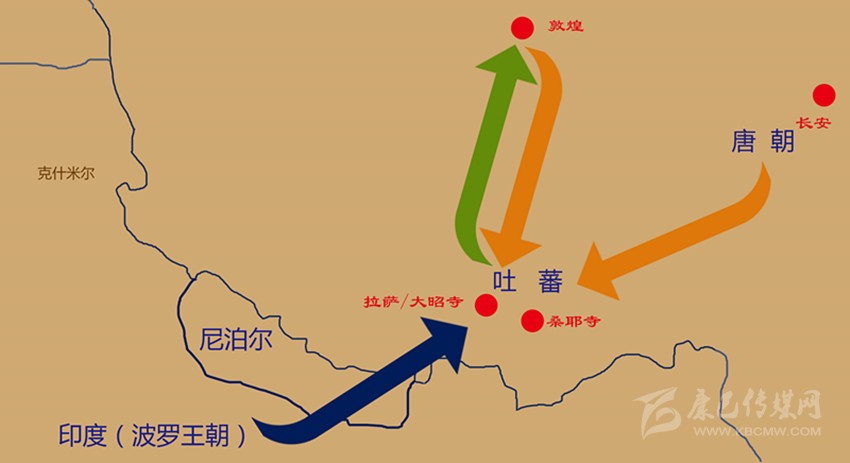 另外,在唐代敦煌繪畫(huà)《藥師佛及兩菩薩》的畫(huà)面上,藥師佛及脅侍菩薩造型和大昭寺法王殿壁畫(huà)的風(fēng)格非常一致的,都是屬于印度波羅藝術(shù)風(fēng)格。但是畫(huà)面中部的文殊菩薩、普賢菩薩則又是中原漢地繪畫(huà)風(fēng)格。在這幅畫(huà)的背后有藏文和漢文的題記,講述這幅畫(huà)是由一個(gè)叫白央的藏族畫(huà)家和幾個(gè)漢族畫(huà)家一起合作完成的。印度的風(fēng)格影響到了敦煌,同時(shí)敦煌的中原繪畫(huà)風(fēng)格又再次傳到了吐蕃。從這些情況可以看出:前弘期的繪畫(huà)風(fēng)格是深受印度波羅藝術(shù)和漢地繪畫(huà)藝術(shù)的雙重影響。