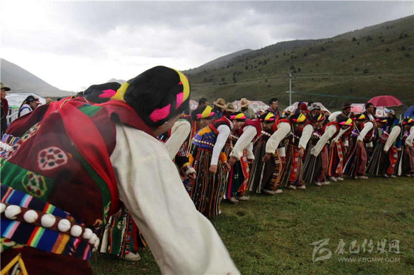 10月2日,在木雅鍋莊悠揚的旋律和輕盈的舞步中,歷時兩天的“2017康定情歌國際音樂節(jié)”盛大開幕,作為“五大民俗展演”中的特色民俗歌舞表演部分,木雅鍋莊吸引了眾多游客的關(guān)注。木雅鍋莊來源于木雅人的日常生產(chǎn)和生活,是當?shù)剞r(nóng)耕文化習(xí)俗的重要表現(xiàn),表演服飾多以棕紅色外套,紅、白色襯衫為主,表演者多佩戴紅頭繩、珊瑚、金銀等裝飾物。舞蹈分男女兩組,列隊圍桌成圓形,皆彎腰垂首隨領(lǐng)唱歌聲而舞。男組舞姿氣勢豪放,女組舞姿委婉優(yōu)雅。唱腔宛轉(zhuǎn)悠揚,吸引了在場觀眾冒雨駐足觀看,有的甚至情不自禁隨著舞群踏起了舞步,融入到康巴文化的神秘魅力當中。