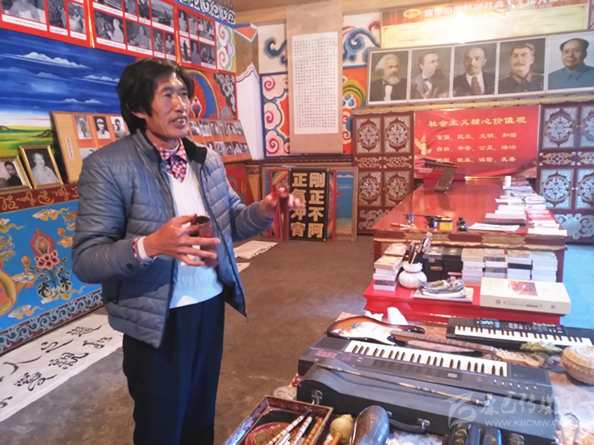 到了九龍,記者幾次打算采訪呷爾鎮(zhèn)原文化站站長王長生。王長生,人稱王老表。65歲的王長生本該退休在家安享晚年,然而,作為九龍乃至甘孜州的文化名人以及他在開展群眾工作方面的建樹,退休后,他依舊是個(gè)大忙人,黨的十九大勝利召開后,作為省級優(yōu)秀宣講員,為了搞好宣講,他潛心備課,黨的十九大精神宣講全面鋪開后,他與宣講團(tuán)成員一道奔赴瀘定、丹巴、雅江、九龍等縣農(nóng)牧區(qū)宣講。12月12日,他忙里偷閑,在美觀整潔的家里接受了記者的采訪,多才多藝的王長生向記者展示了他高超的才藝。