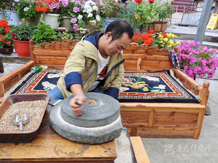 扎呷介紹說(shuō):水淘糌粑的制作工藝非常講究,分四步。首先要選用優(yōu)質(zhì)青稞風(fēng)干篩好,放入山泉水中洗凈、曬干,再用熱水淘洗,瀝干水分趁熱裝人麻袋密封,保持恒溫,放上一夜。第二天,燒熱平底大炒鍋,揭開麻袋自然會(huì)聞到一股酒香味,然后倒人炒鍋,不停翻炒。炒青稞關(guān)鍵要掌握好火候,不焦不生,出現(xiàn)青裸花后就炒好了。待炒好的青稞冷卻后,裝入皮口袋,送到磨房,經(jīng)水磨磨出的糌粑,粉細(xì)、色澤潔白、味香可口。