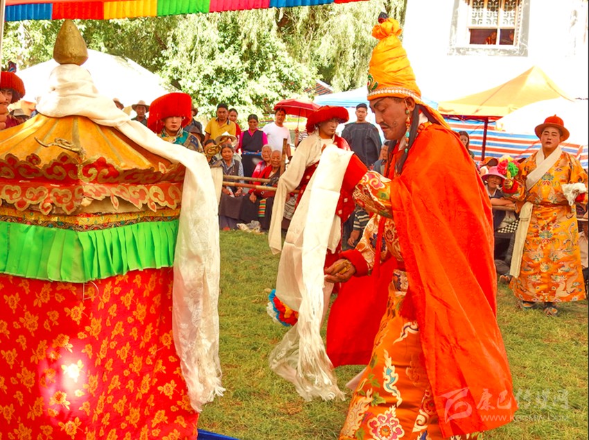 清順治十年(1653年),西藏五世達(dá)賴派德莫諸古到巴塘仿照拉薩哲蚌寺洛色林修建了丁寧寺大殿。大殿落成裝飾一新,舉行開光典禮時,在丁寧寺十四納卡活佛庚呷洛絨曲珠從西藏請來的藏戲大師群覺納的指點下,由寺僧表演了《江嘎冉》《扎西協(xié)哇》等藏戲劇目。