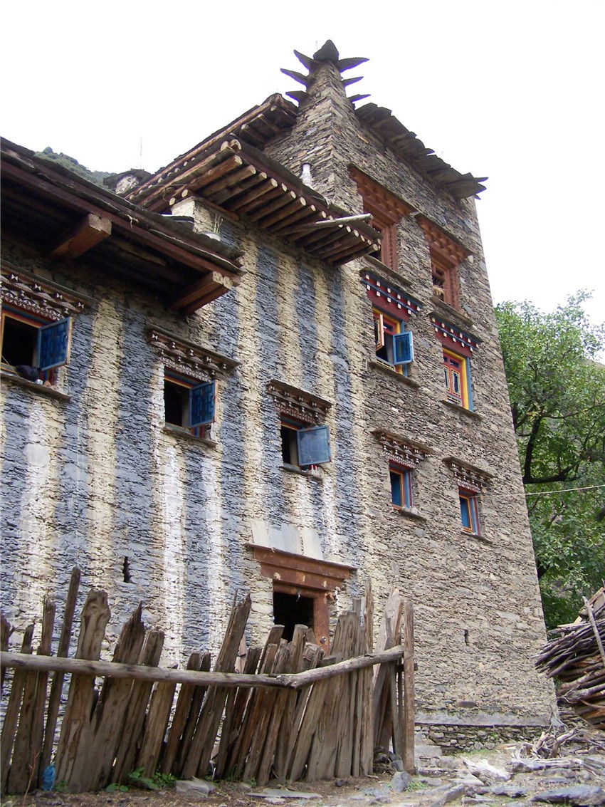道孚扎壩碉房墻上刷有藍(lán)白相間的條紋。2006年攝