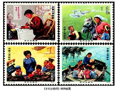“燃燒自己,照亮別人”,是每一位教書人的精神寫照。在我國發(fā)行的郵票中就常常出現那些工作在基層的普通教師的忙碌身影。1959年9月25日,我國發(fā)行《人民公社》特種郵票,其中第5枚“學”,圖案是一位手執(zhí)課本神情專注地在課堂上教學的老師。這是我國郵票中首次出現教師形象。1966年5月10日,我國發(fā)行《服務行業(yè)中的婦女》特種郵票,其中第4枚“保育員”,是反映我國幼兒教師工作情景的一枚郵票。1976年2月20日,我國發(fā)行《勝利完成第四個五年計劃》紀念郵票,其中第13枚“牧區(qū)小學”,圖案是一位藏族女教師在寬敞明亮的教室里授課的情景,反映了新中國成立后,特別是第四個五年計劃期間,我國少數民族地區(qū)飛速發(fā)展的教育事業(yè)。1975年3月8日,我國發(fā)行《鄉(xiāng)村女教師》特種郵票,全套4枚,圖案分別是“認真看書學習”“巡回教學”“開門辦學”和“水上小學”。全套郵票是工作在廣大農村的中小學教育工作者在辦學條件艱苦的情況下仍然堅持認真學習、勤奮工作、忠于黨的教育事業(yè)的真實寫照。