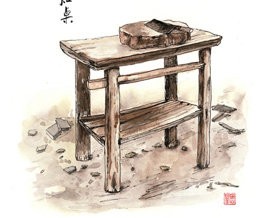 在我們家,灶屋里砌著一個四方形兩灶孔的大正灶,兩條寬板長凳靠墻擺放,交于墻角,像木匠的大曲尺,半圍著象征一家之主的正灶,其中一條正對著灶門口。灶與凳之間的通道,僅容曲膝而坐。灶上常年擱著烏黑的鼎灌和鐵鍋,灶的背面則立著一張長條狀的灶桌。灶桌是洗碗和切菜的地方,在其橫長的縫隙里插上接手板,懸空于灶面之上,擺上碗筷,又起到了飯桌的功能。灶屋進門的另一面墻,靠墻而立的,是高高的碗欃和一個瓦水缸。碗欃是平素放碗放剩菜的地方,本是漆了老紅色,卻因西墻的木格窗小,光線幽暗,與四壁及樓板的烏黑融為了一體。水缸上口有一塊擱板,板上放兩只寬口瓦缽,缽里各放著一只竹筒水勺,一大一小。每天早晚,家人擔了木桶,挑來井水倒入水缸,此處的地面,長年潮濕。灶屋是我們一日三餐吃飯喝茶休息閑談的場所,煙火歲月,多是在此度過。我開蒙上小學后,每到夜晚,吃過飯后,將煤油燈盞移到寬板長凳,雙膝跪地,伏在凳灶之間的空隙里寫作業(yè),有時一不小心,額前頭發(fā)就被燈盞的火焰燒得焦臭。我自小愛學習,成績很好,每學期都有獎狀,老師夜里來村間家訪時,也常來我家坐,是我父母最大的榮光。