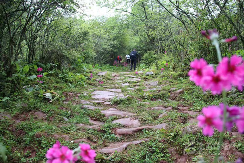 古道崎嶇,路險泥滑,穿溪越澗,我們相互鼓勵,相互幫助艱難下行。半山的坡地林間,三五株一束,七八株一叢,殷紅的報春花滿山遍野,染紅延綿起伏的山坡。