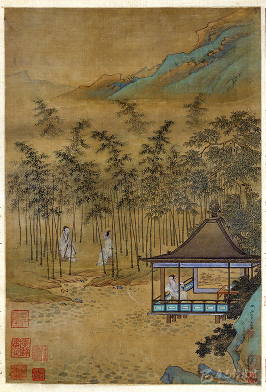 此圖意境極像唐代詩人王維的藍(lán)田山別墅。這里林木茂密,山澗淙淙,館舍、房屋散布其間,每到夏季,山風(fēng)習(xí)習(xí),涼爽怡人,王維和文友們?cè)诖硕认谋苁?,垂釣飲酒,談?wù)撛娢?,修身養(yǎng)性,過著悠閑自在的隱居生活。他在《竹里館》一詩里寫過自己的隱居快樂感受:“獨(dú)坐幽篁里,彈琴復(fù)長嘯。深林人不知,明月來相照。”全詩格調(diào)幽靜閑遠(yuǎn),仿佛詩人的心境與自然的景致全部融為一體了。宋朝詩人楊萬里喜歡在皎潔的月光之下,清輝孤影,來到搖曳的竹林中,聽著夏夜里悅耳的蟲鳴,夜深氣清,盡管沒有涼風(fēng)送爽,但是悶熱暑氣頓時(shí)消失,于是他寫了一首《夏夜追涼》詩:“夜熱依然午熱同,開門小立月明中。竹深樹密蟲鳴處,時(shí)有微涼不是風(fēng)。”