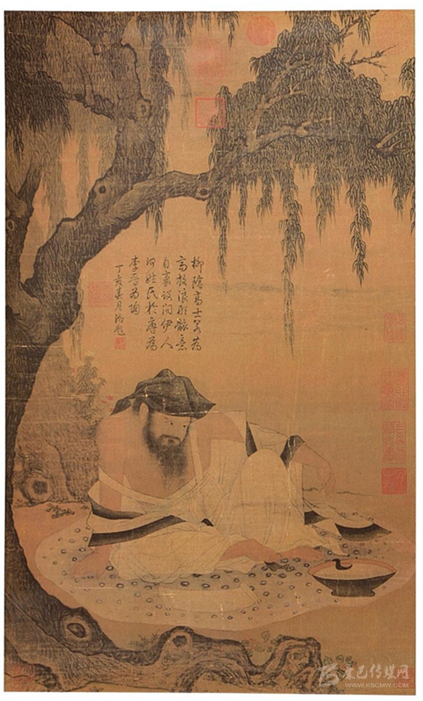陶淵明曾說:“夏月虛閑,高臥北窗之下,清風(fēng)颯至,自謂羲皇上人?!币粋€(gè)高人隱士酒后高臥草廬窗下,悠閑自得乘涼的形象躍然紙上。唐代詩人李白非常向往陶淵明恬淡閑逸、與世無爭(zhēng)、天人合一的隱逸生活,寫詩曰:“陶令日日醉,不知五柳春。素琴本無弦,漉酒用葛巾。清風(fēng)北窗下,自謂羲皇人。何時(shí)到栗里,一見平生親?!北磉_(dá)了對(duì)陶淵明人品和理想的仰慕之情?,F(xiàn)藏于臺(tái)北故宮博物院的宋人《柳蔭高士圖》即是此意境。據(jù)《石渠寶笈》記載,此圖為素絹本著色畫,左方下有孫承澤印,右方下有北平孫氏印,左邊幅有棠村審定、蕉林二印。只知為宋人之作,相關(guān)的背景則無從查考。畫中為一棵古柳樹,樹干虬曲剛勁,枝葉繁茂。樹下一翁,美髯飄忽,袒胸露腹,頭戴葛巾,赤足席地而坐。坐前有一幅展開的手卷,酒樽滿盈,淺斟低酌。表面上看此翁雙目聚神,凝視手卷,實(shí)則已是眼餳耳熱,醺醺然不勝桮杓。清乾隆皇帝對(duì)《柳蔭高士圖》十分喜愛欣賞,在畫上御筆題詩云:“柳蔭高士若為高,放浪形骸意自豪。設(shè)問伊人何姓氏,于唐為李晉為陶?!鼻〉壅f,這位高士如是唐人就是李白,如是晉人便是陶淵明。但是從服飾和環(huán)境看,應(yīng)是五柳先生陶潛也。這幅圖所表現(xiàn)的就是“心靜自然涼”。