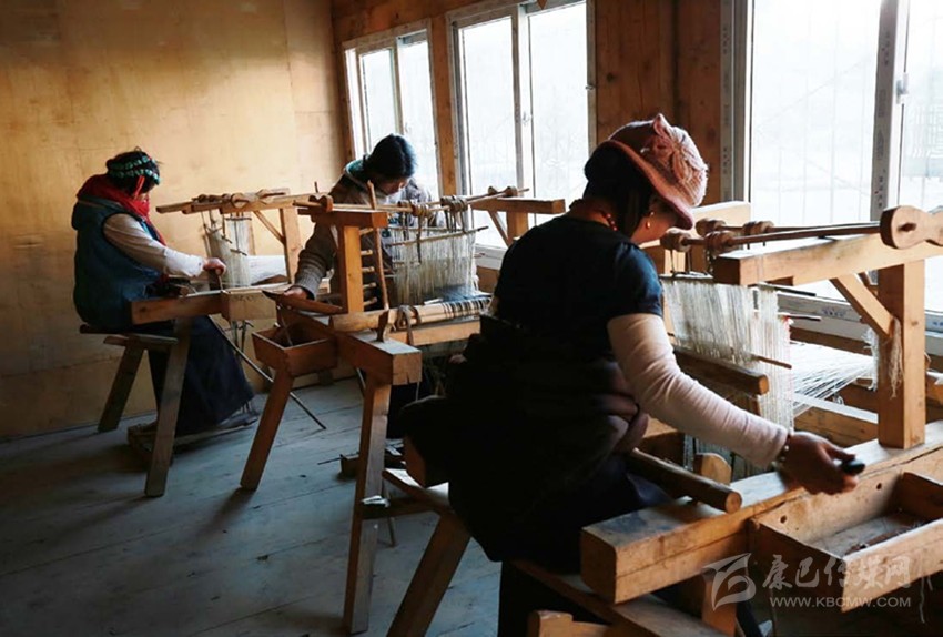 2003年,“編織班”邀請(qǐng)澤巴姆為老師,將這項(xiàng)技藝傳承了下來(lái)?,F(xiàn)在,澤巴姆年紀(jì)大了,牛羊毛絨編織這樣繁復(fù)又耗體力的事情她不再做了,全交給了自己的媳婦扎西巴姆——當(dāng)?shù)匚ㄒ坏呐Q蚪q編織老師。第二天,我們?cè)诰幙棸嗟墓し焕镆?jiàn)到了扎西巴姆。工坊一角的木架上擺著為數(shù)不多的圍巾、墊毯等產(chǎn)品,窗邊平行擺著六臺(tái)織機(jī),扎西巴姆正帶著幾個(gè)藏族婦女坐在其間飛梭走線。陽(yáng)光從窗戶透進(jìn)來(lái),投射在織機(jī)和織女們身上,古老的場(chǎng)景、緩慢的節(jié)奏恍惚把我?guī)Щ亓俗婺傅臅r(shí)代。扎西巴姆說(shuō),當(dāng)?shù)厝朔Q牦牛絨為