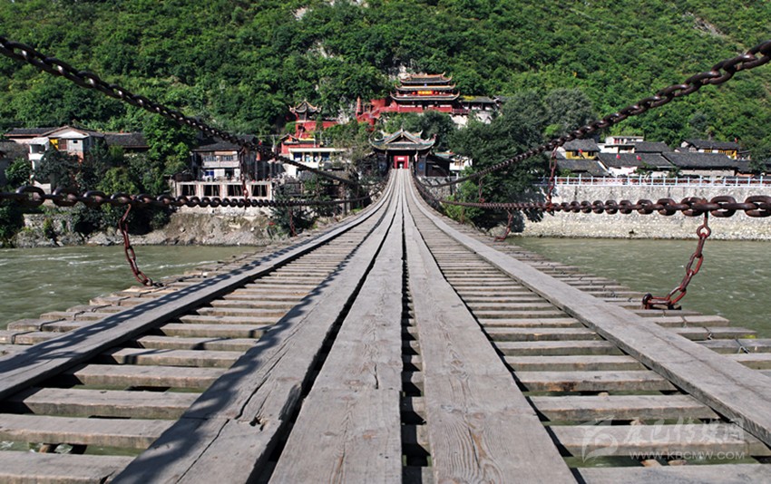 手握粗大烏黑的鐵鏈,感覺得到它的滄桑歷史與厚重沉淀,當年的工匠甩起膀子捶打鐵鏈時四處飛濺的火星,仿佛在眼前不停噴酒;扣住碩大亮堂的鐵環(huán),簡直是在觸摸久遠歲月的流失與人非物是的變故;當年匠人舉著大手操起鐵鉗子將滾燙通紅的鐵環(huán)放入水中時發(fā)出“哧哧哧哧”的聲音似乎在耳旁久久回蕩;踩踏橋面上的板子,分明看見當年舍死忘死的勇士們在硝煙彈雨之中匍匐前進,犧牲紅軍戰(zhàn)士殷紅的鮮血染紅了大渡河的浪花;凝視滾滾翻騰的波濤,依稀可見當年民眾將鐵鏈糸在竹筒上兩頭對拉的場景,眾人在兩岸使力時發(fā)出“嗨約嗨約”的吆喝聲地動山搖震撼人心……