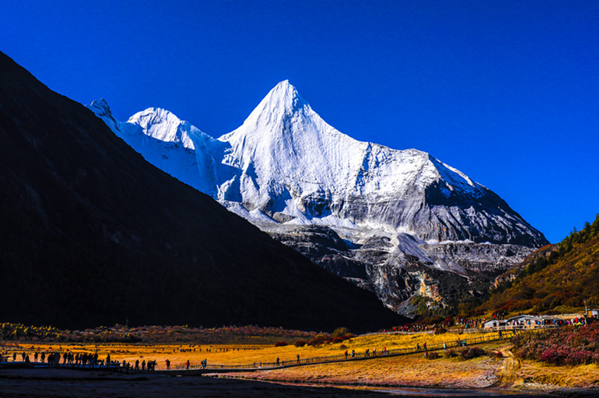 走過山走過水,觀一路秋色,描摹一生的畫卷。在亞丁的晚秋,可以感受“遠看山有色,近聽水無聲”的畫面,在亞丁的晚秋,可以體驗“愁因薄暮起,興是清秋發(fā)”感覺。在亞丁的晚秋,總會有李清照那句“秋已暮、紅稀香少。水光山色與人親,說不盡、無窮好”在腦海浮現(xiàn)??偢袊@景色太美,文筆笨拙,要是“俱懷逸興壯思飛,欲上青天覽明月”的李白在“抽刀斷水水更流,舉杯消愁愁更愁”的多愁善感里描繪三怙主的雄奇與牛奶海的柔美,那不知道又是一個多么驚世駭俗的偉大手筆?沒有也許,只有在些許的缺憾中努力書寫屬于這個秋的一切。是的,秋已暮,珍珠海的水碧波不興,雪山的倒影更顯雄偉與圣潔。秋已暮,五彩山林和潺潺流水纏綿無盡,已經(jīng)把美輪美奐的山水畫鋪展在天地間。秋已暮,牧歸炊煙起,草原已寂靜。