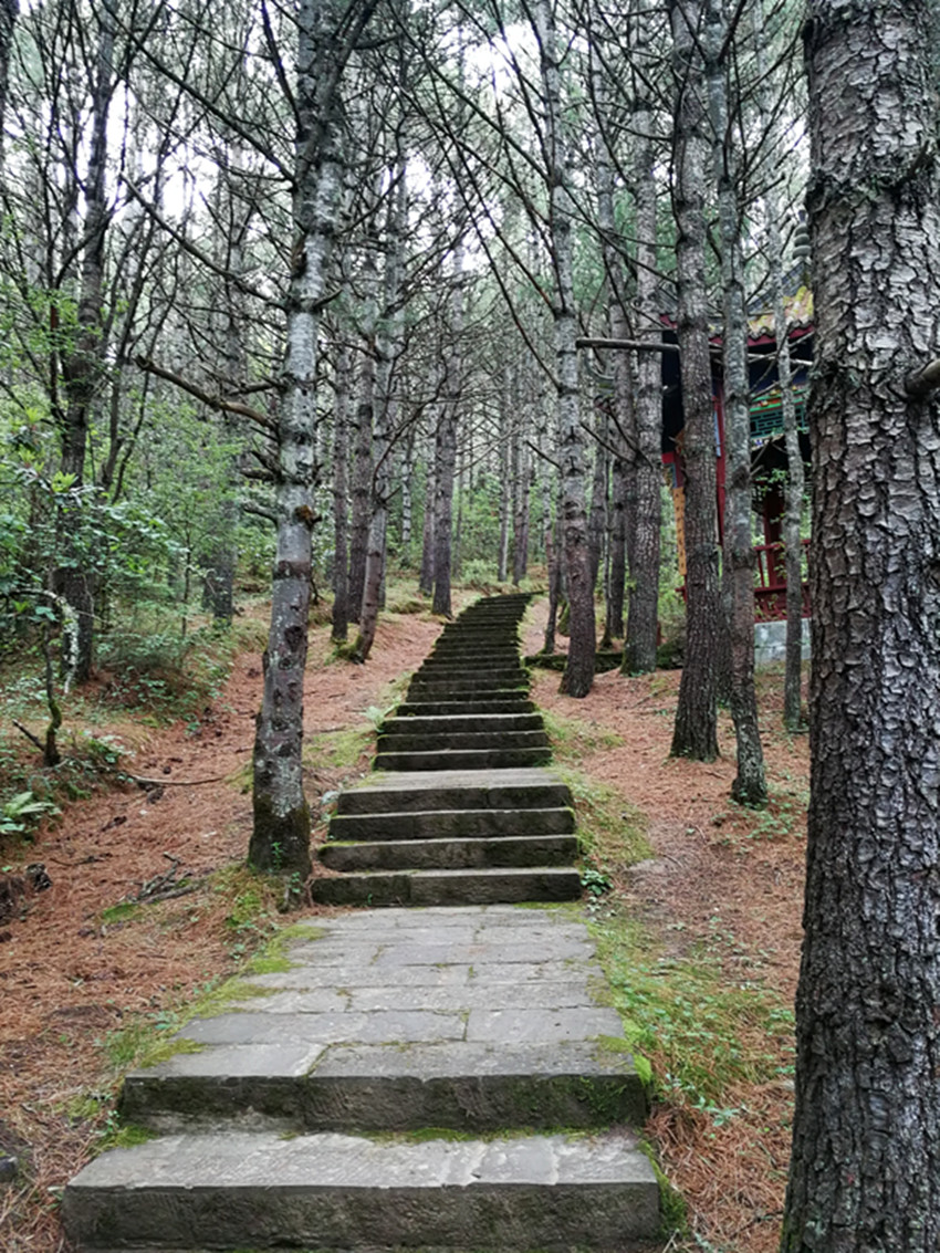 如今多年沒(méi)見(jiàn)到過(guò)石燕了。封山育林后,跑馬山白楊和松林已是茂密葳蕤,四道巖仍在萬(wàn)綠叢中屹然而立。由山腰長(zhǎng)廊有小徑直達(dá)四道巖頭。巖頂上彩幡獵獵,隨風(fēng)作響,有回欄瞭棚立于巖頭,城區(qū)容貌盡收眼底。原來(lái)是康定城里幾個(gè)與我差不多同時(shí)代的人在此“心歸佛塵”。觀山望景人時(shí)有之,喝茶閑棋之人亦有之,四道巖竟成康定一民間打造絕佳景點(diǎn)。只是這“四道巖”的稱(chēng)謂鮮有人提起。