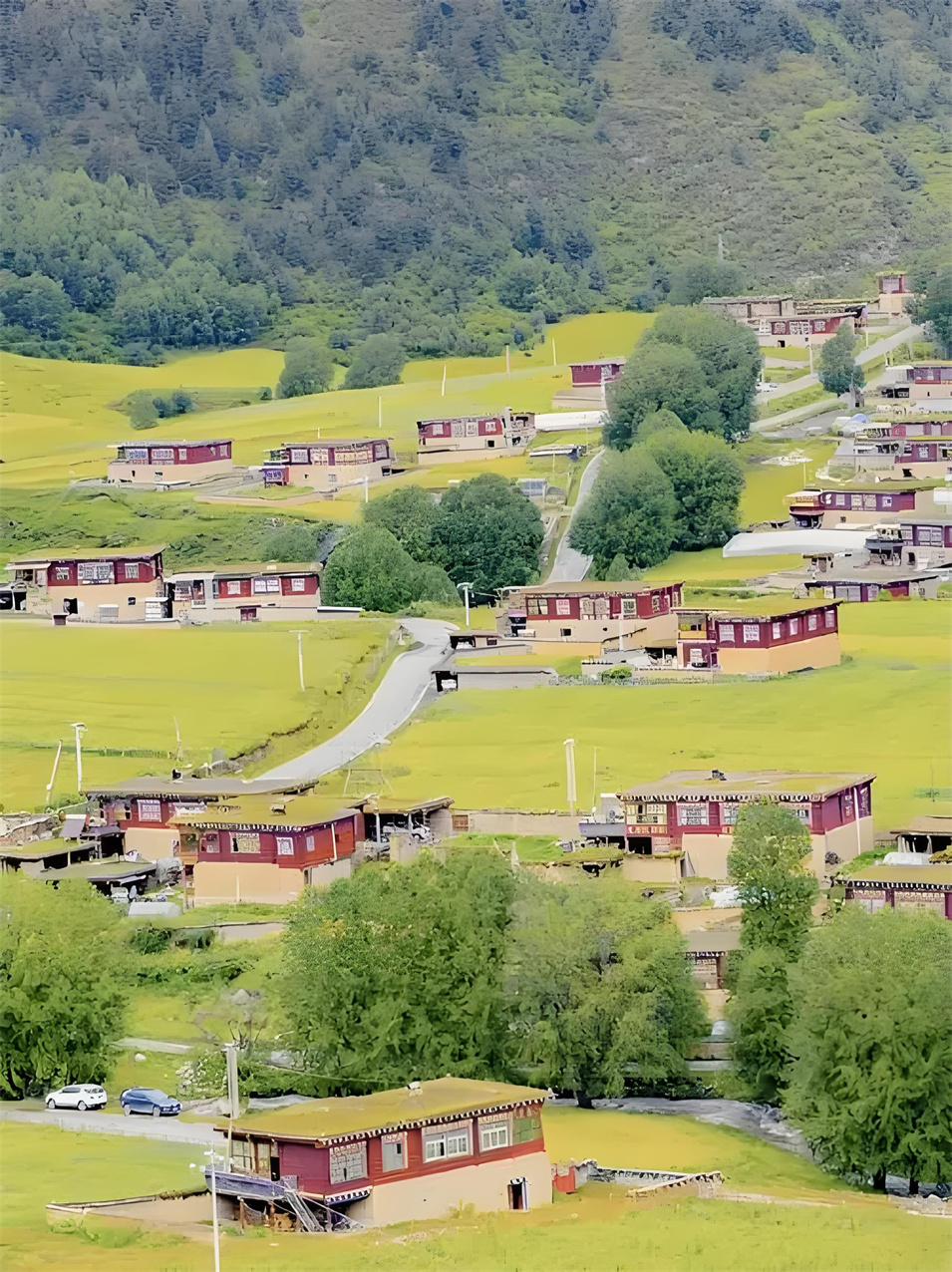 眼前,河谷兩旁的青山上,長滿參天古樹,像一個(gè)個(gè)衛(wèi)士守護(hù)著這片綠洲;沙魯里山脈的冰雪融水順著蜿蜒的麥曲河,澆灌著兩旁綠意蔥籠的青稞地、豌豆地,滋潤著彌漫香味的種有中藏藥材的土地;絳紅色藏房散落在河谷間,不時(shí)有小孩打開窗戶,探出小腦袋,羞澀地露出滿臉燦爛的笑容;臉上布滿高原紅的阿姐沖我們打招呼,說著我們不太懂的藏語,充滿熱情。