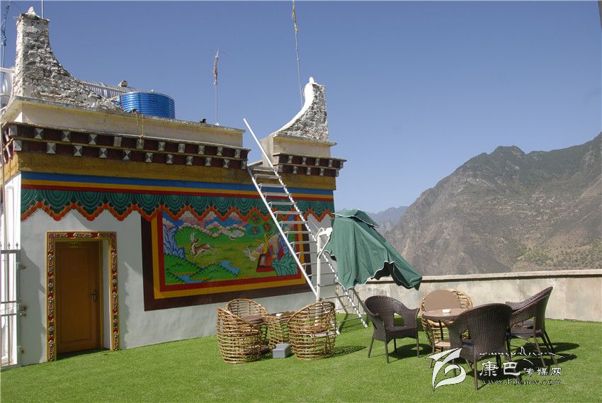 客棧的設(shè)計(jì)完全是藏式風(fēng)格,很吻合楊荻給客棧起的名字:圣地映像。從大廳開(kāi)始一直到客房,金碧輝煌、雕梁畫(huà)棟,每一處空間都被藏地色彩充滿。樓頂,視野開(kāi)闊,左手青山,右手青天。幾個(gè)內(nèi)江來(lái)的客人已在客棧呆了好幾天,他們正在燦爛陽(yáng)光下商量爬山的事,他們一再和楊荻碰面,希望晚上回到客棧能吃上本地的土雞。