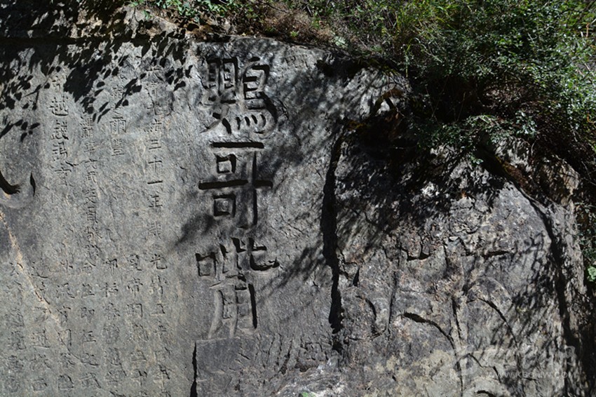 《竺國(guó)通衢》刻在一顆大石頭的下部,石高約三米,長(zhǎng)約六米,刻于清道光年間,意為通向印度的通道,充分說明這條道路的價(jià)值和作用。大石和字已藏在核桃樹下,勢(shì)大必難除,加之雨水侵蝕下已風(fēng)化嚴(yán)重。
